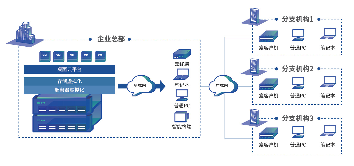 | 随着业务的发展,越来越多的企业开始布局分支机构,并通过广域网实现各分支与总部的互联互通。在“总部-分支”架构下,企业的终端信息化建设存在终端分散、类型多样,管理维护难度大;数据安全性难以保障,以及系统&应用软件问题多等困境。特别对于各分支机构来说,一旦终端出现问题,需要IT运维人员去到现场进行维护和管理,费时费力,极大影响分支机构的办公效率。 |