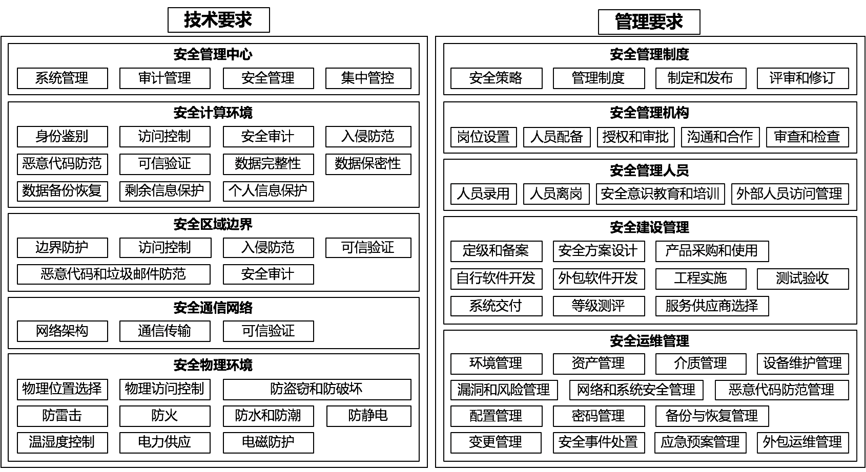 | 《信息安全等级保护基本要求》规定了不同安全保护等级信息系统的基本保护要求,包括技术要求(五项)和管理要求(五项),用于指导分等级的信息系统的安全建设和监督管理。 |